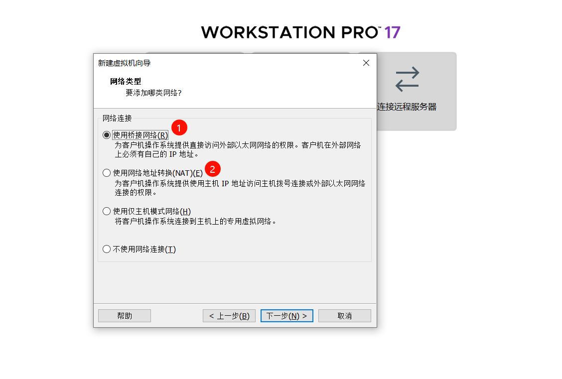 选择网络类型,因为我在公司有两台设备,一台专门用作虚拟机,另一台用作远程连接,所以为了方便选择了桥接网络,如果你只有一台设备的话,建议选择NAT网络地址共享宿主机网络。