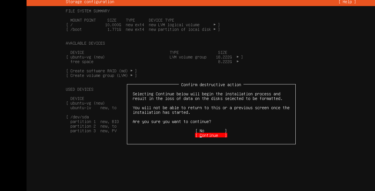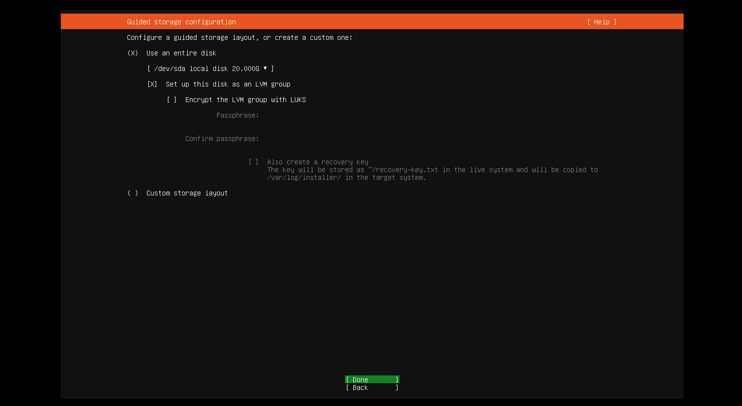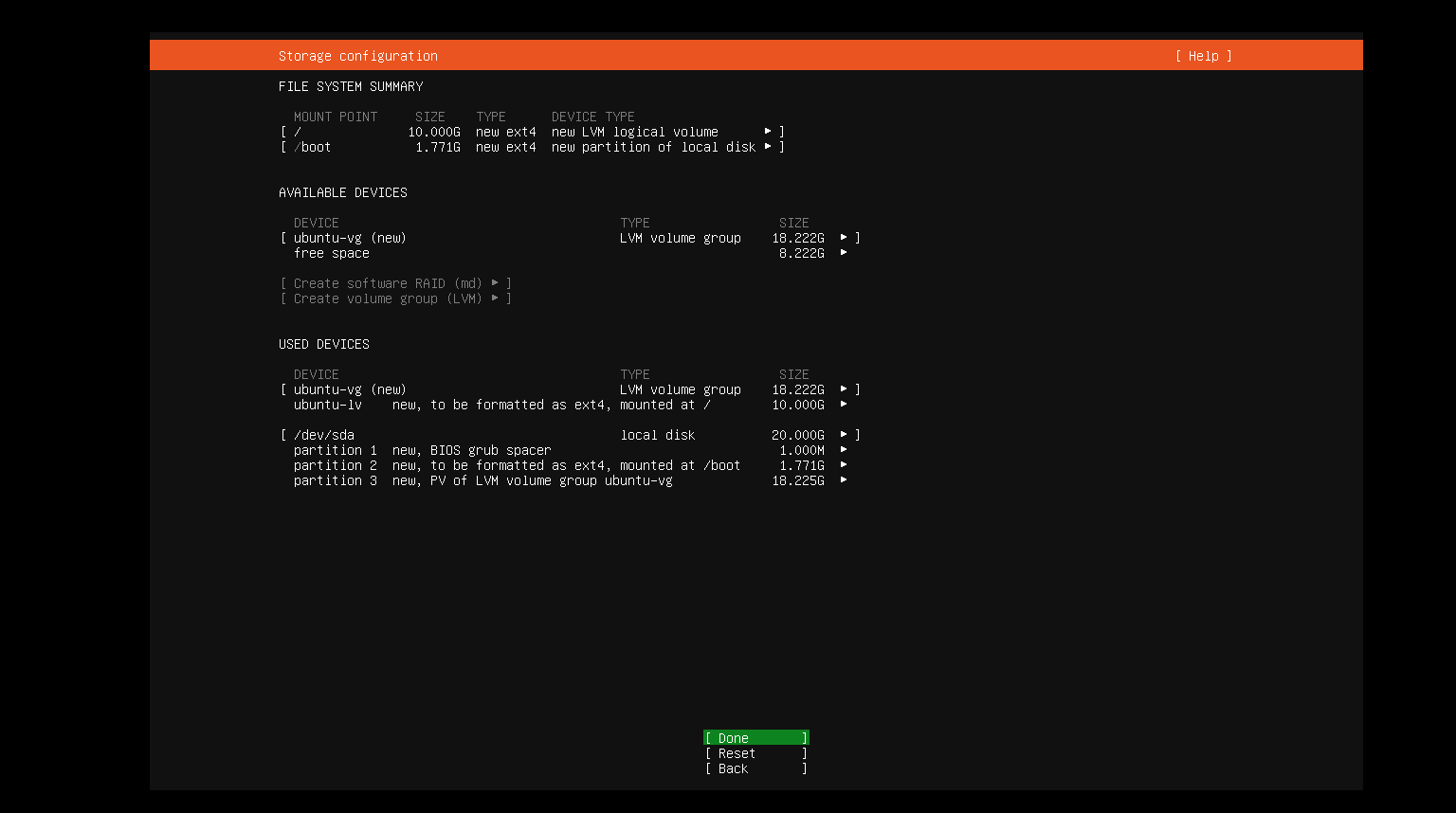 磁盘分区,默认是LVM格式,不需要修改,直接按上下键调整到Done位置按回车即可