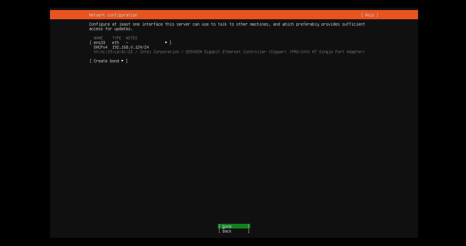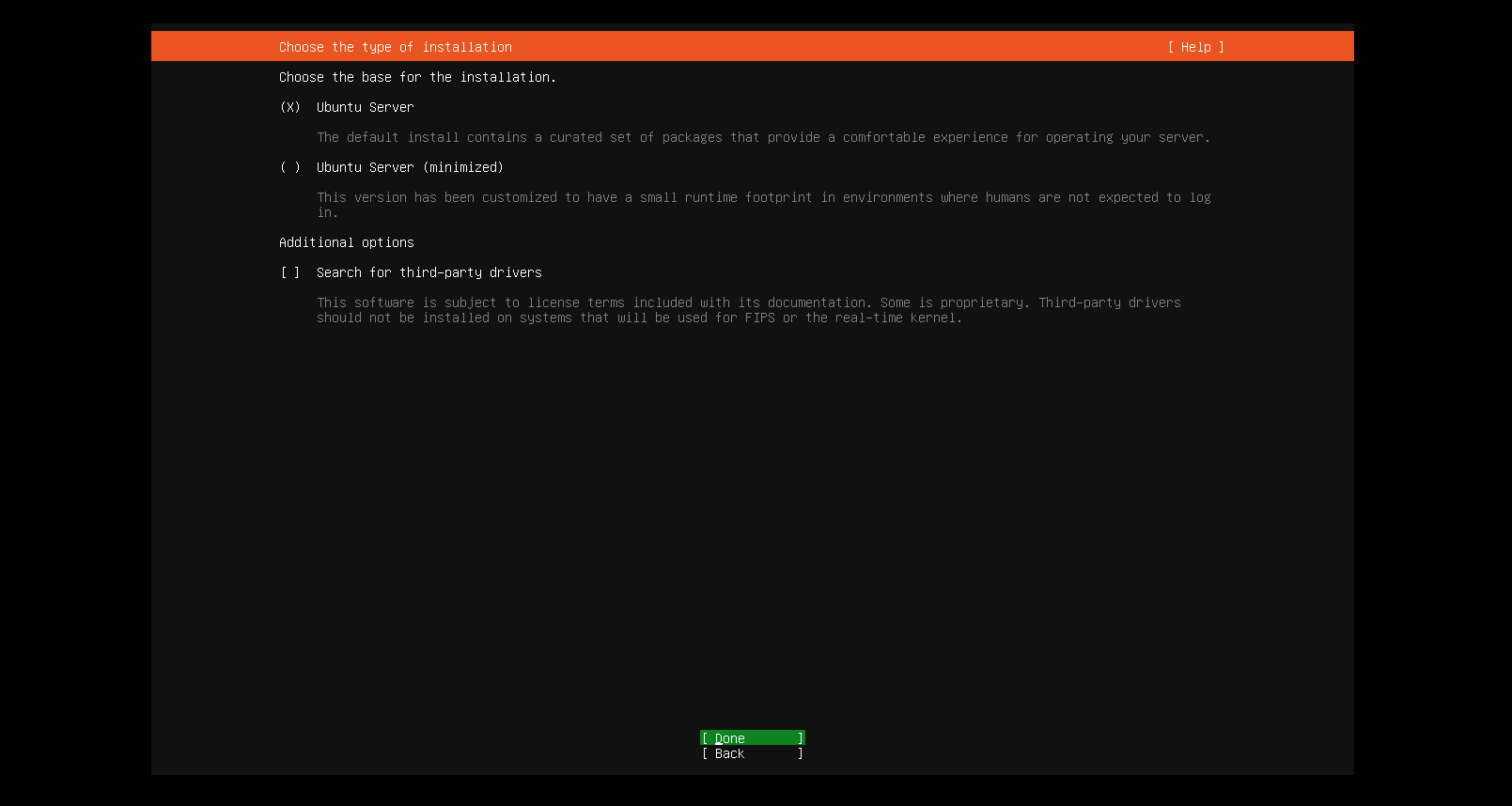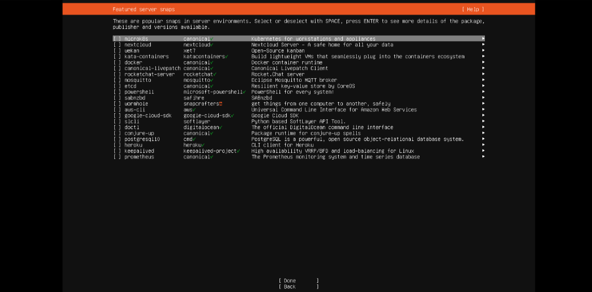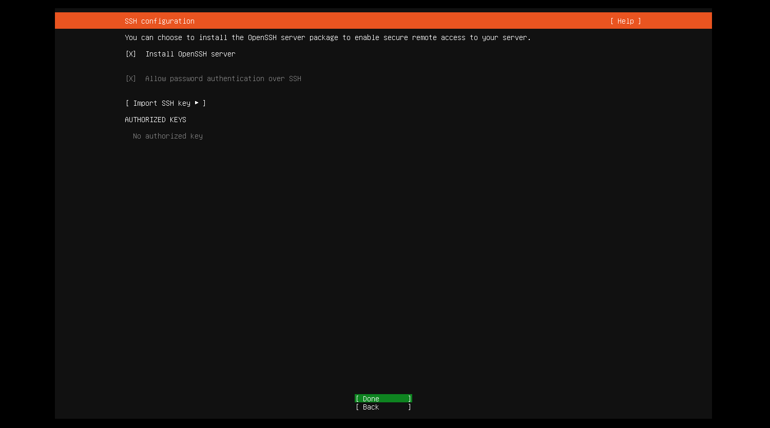 如果需要远程管理服务器,可以安装ssh服务,在安装过程中会有提示,选择安装即可,光标调整到Done按回车继续