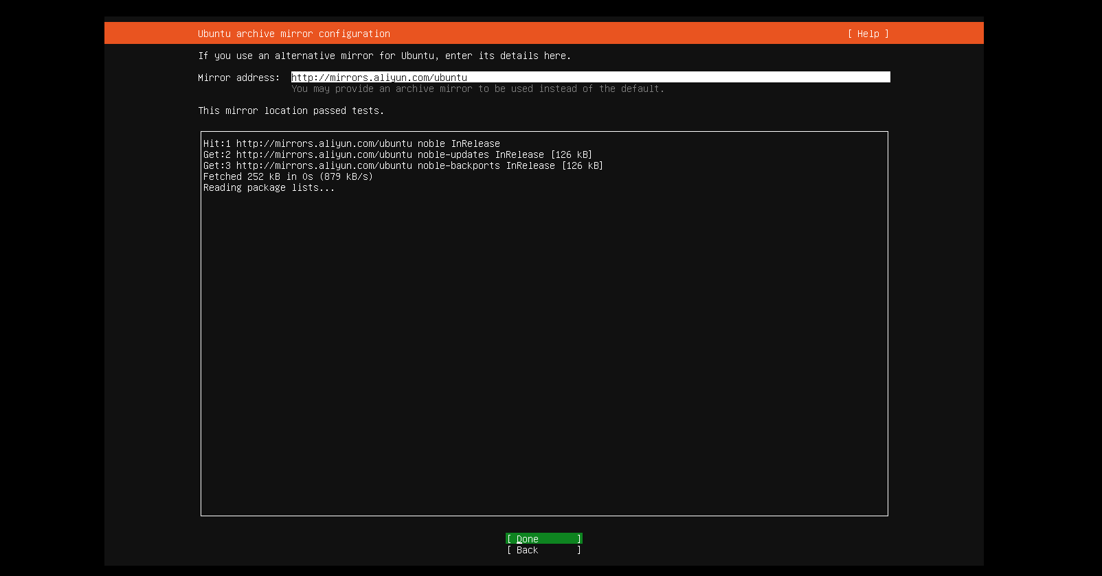 配置Ubunutu镜像源,我这里配置了阿里云镜像源,https://mirrors.aliyun.com/ubuntu/。按住Enter键继续