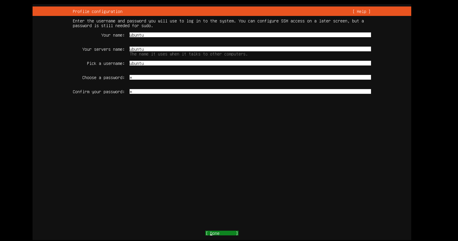 设置用户名和密码,注意,Ubuntu Server默认不允许使用root账户登录